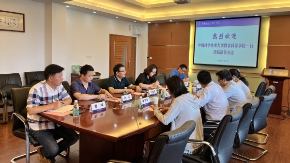 8月17日,中国科学技术大学数学科学学院党委书记、执行院长黄文、副院长王毅、党委副书记王莉、研究生教学部主任黄稚新到我校英国365公司官网进行工作交流座谈。英国365公司官网党委书记许静、院长王春武、党委副书记周佼佼、副院长徐江、副院长蒋建林、数学系主任曹峰热情接待来访嘉宾并参加座谈交流。