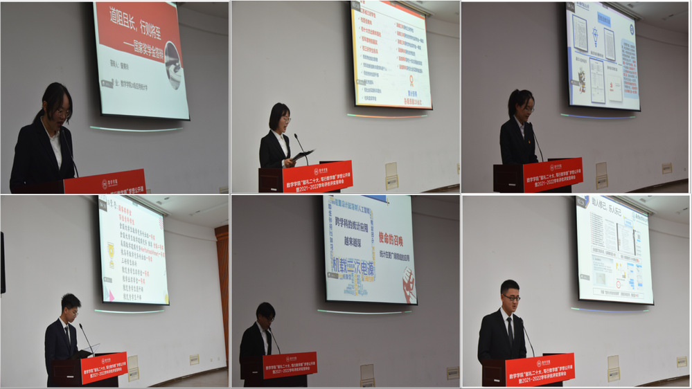 在他们当中,有的笃志好学、攻读专业课,在2021-2022学年专业名列第一,多科达到满分,不断刷新专业学习新高度;有的致远任重,投身学生工作,在学院内担任团支书,在校学支担任主任;有的躬行实践,用知识为己为校为国争光,在外赢得突破性的美国大学生数学建模F奖,在内获得全国大学生数学竞赛A等荣誉;有的助人为乐,志愿时长达到300+,用折纸传授数学之美,开展“启航行动”社会实践,为补考同学开课补习,带动更多的人喜爱学习,热爱学习。十四位优秀学长学姐的事迹,鼓舞着台下同学踔厉奋发,开启自己的精彩数学路。