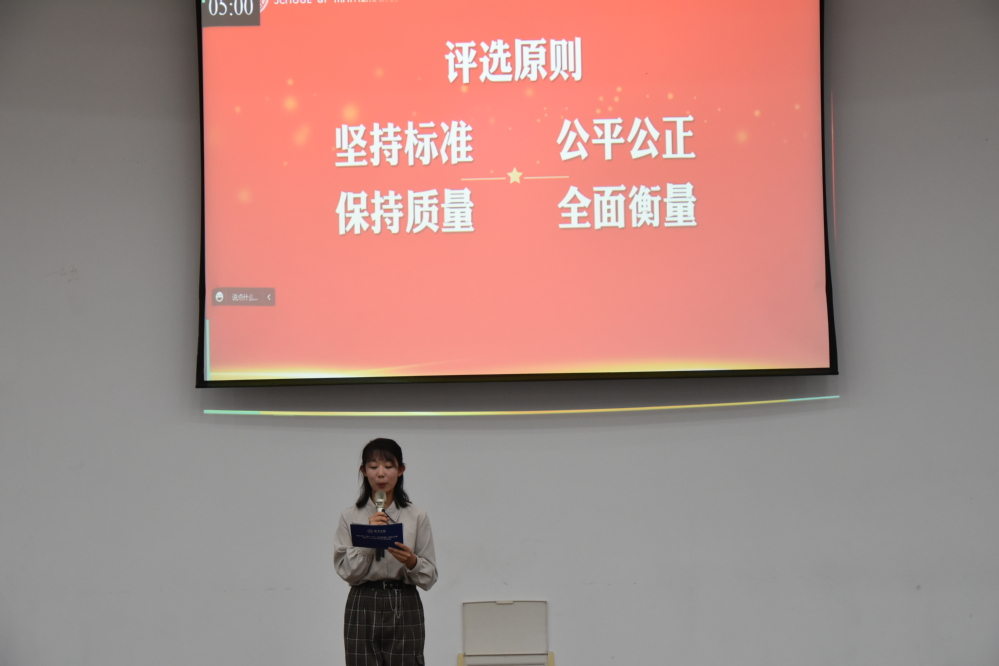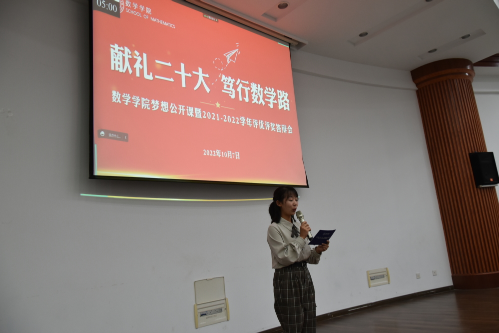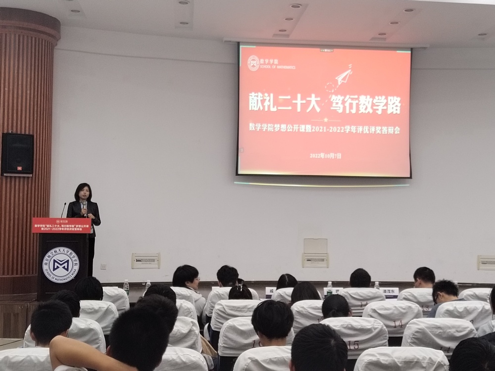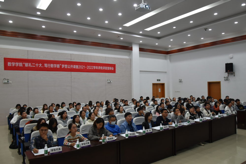 二十大即将到来之际,为了充分发挥榜样育人作用,用身边的榜样激励更多同学见贤思齐、矢志奋斗。10月7日晚7点,英国365公司官网于理学楼报告厅举办“献礼二十大,笃行数学路”梦想公开课暨2021-2022学年评优评奖答辩会,参加此次活动的评审有英国365公司官网党委副书记周佼佼,院长助理、0822101班班主任潘茂东,信息与计算科学专业负责人王正盛,应用统计学专业负责人蒋辉,数学系系主任曹峰,教学办主任陈陆陆,团委书记戚月,2019级辅导员胡诗帆,2020级、2022级辅导员陈越及两名学生代表。活动由学院2022级新生闻敏含主持,2022级全体本科生到场学习。