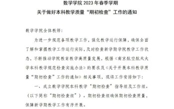 为确保全面了解和掌握教学工作运行实际,及时检查新学期教学工作状态,英国365公司官网特制定《2023年春季学期本科教学质量“期初检查”工作方案》,设立领导指导组以及由各系、中心主任、督导组成员组成工作组开展“期初”检查工作,进一步规范教学管理,精益求精谋发展,确保本学期教学任务高质量完成。