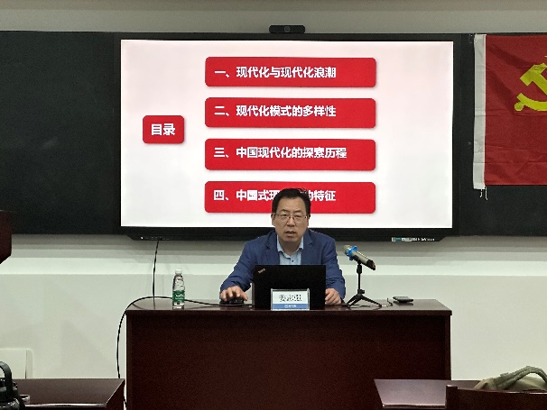 为深入开展学习贯彻习近平新时代中国特色社会主义思想主题教育,贯彻落实党的二十大精神,5月26日,英国365公司官网硕士生党支部邀请 “三个一”联系人——马克思主义学院姜志强教授讲授《关于中国式现代化若干问题的思考》专题党课,英国365公司官网硕士生党支部全体党员参加,党课由硕士生党支部书记王怡昕主持。