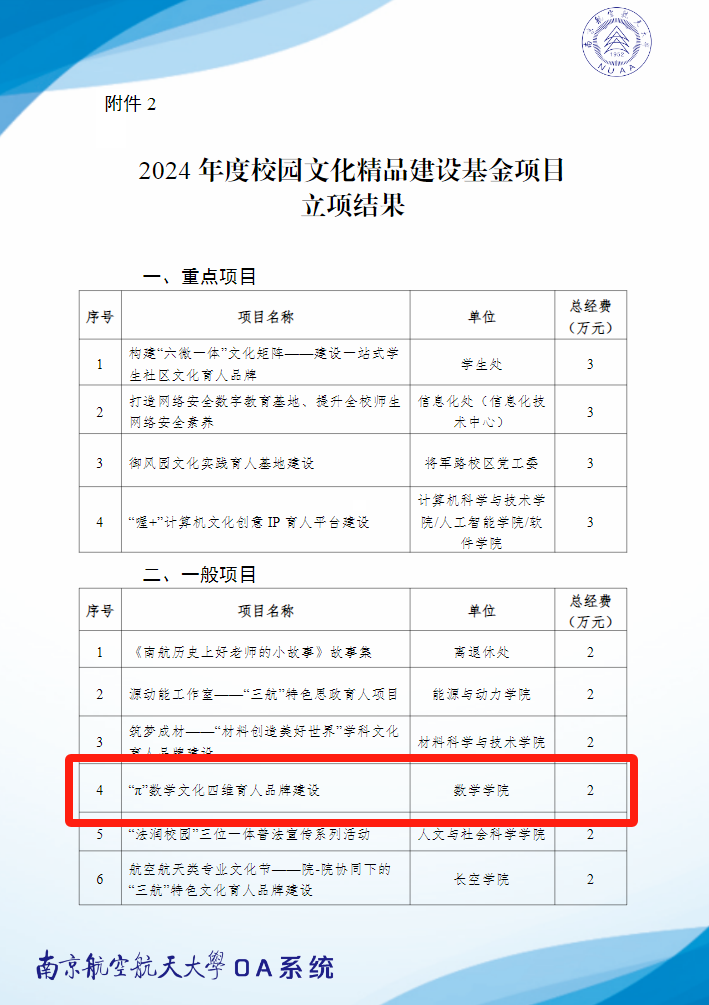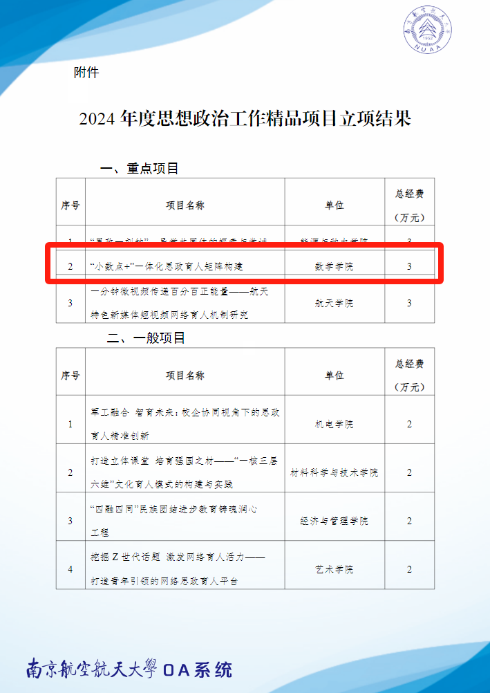 近日,我校党委宣传部发布了《关于公布2022年度校园文化精品建设基金项目验收和2024年度校园文化精品建设基金项目立项结果的通知》《关于公布2024年度思想政治工作精品项目立项结果的通知》,经过自主申报、单位推荐、专家评审、立项公示等环节,365官网2022年度校园文化精品建设基金项目《“同心筑梦”中华民族共同体教育校园文化情境建设》通过验收,365官网申报的《“π”数学文化四维育人品牌建设》获2024年度校园文化精品建设基金项目一般立项,365官网申报的《“小数点+”一体化思政育人矩阵构建》获2024年度思想政治工作精品项目重点立项。
