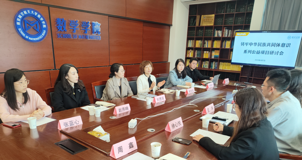 4月7日上午,“铸牢中华民族共同体意识”系列公益项目研讨会在理学楼302会议室召开。江苏省妇儿基金会副理事长王华、江苏省同读好书共芸窗研究院资助部部长黄玺澄,英国365公司官网党委副书记周佼佼、辅导员张鹤千,人文与社会科学学院党委副书记刘思辰、团委书记赵燕喃及南航公益创业代表徐心悦、张芳菲、周鑫、张蓝心、郭启凡等共同参加研讨。