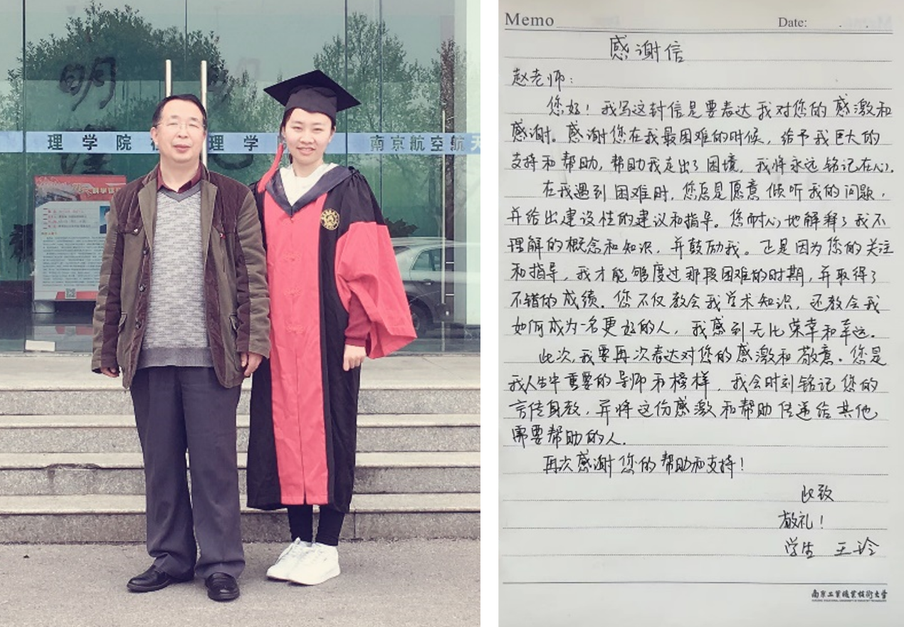 南京工业职业技术大学的王师姐永远忘不了当初赵老师辗转2600多公里,改变她一生的谆谆教诲!博士期间已经博三的王师姐遭遇低潮准备放弃学业。赵老师得知后,当天在上完周五四节课后,即刻赶赴禄口机场乘坐每天唯一到太原的航班,随后又从太原机场转至客运站乘坐大巴去大同,到了大同来不及休息,立即和她家人沟通交流,帮她分析原因调整状态,经过两天恳谈直到看到她状态好转赵老师才放心离开。为了不耽误上课,赵老师周日一大早又乘坐大巴、飞机回南京赶周一早上的课。如今已经是骨干教师的王师姐每每想起当年都会眼含热泪,感慨是赵老师改变了她的一生。