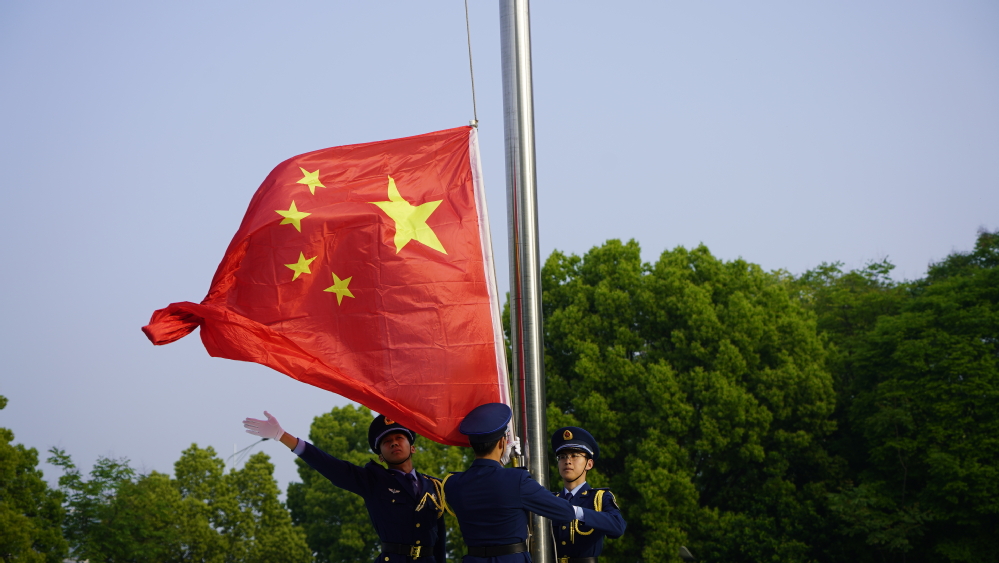 上午七点整,升旗仪式正式开始。在全体师生的注视下,国旗班迈着整齐划一的步伐护送鲜艳的五星红旗入场。伴随着庄严肃穆的《义勇军进行曲》,五星红旗冉冉升起,全体师生目视国旗,庄严肃穆,高唱国歌。