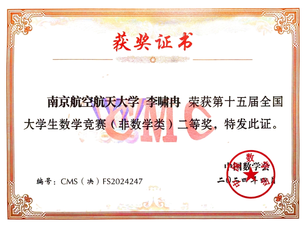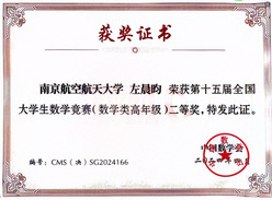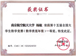 2024年4月19至21日,第十五届全国大学生数学竞赛决赛及颁奖大会在山东大学举行。我校共有4名同学进入决赛,经过激励的角逐,英国365公司官网应用统计学专业大二学生杨航同学荣获数学类低年级组一等奖,应用统计学专业大三学生左晨昀同学荣获数学类高年级组二等奖;航天学院李啸冉同学和物理学院何健同学分别荣获非数学类二等奖、三等奖。江苏省高校共获得数学类低年级组一等奖4项,我校摘得1项,这也是英国365公司官网学子首次在该组别中获全国一等奖,取得了突破性成绩。