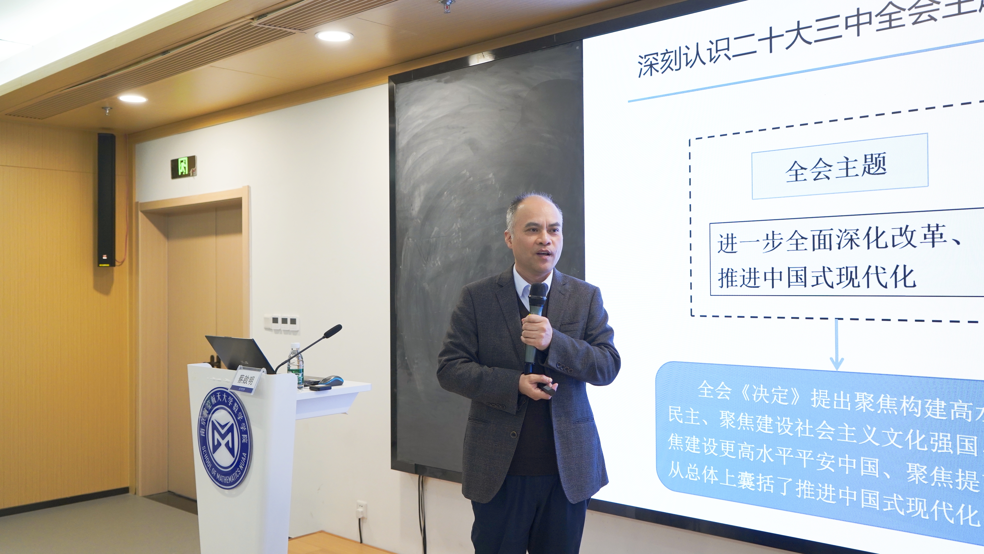 为深入学习贯彻党的二十届三中全会精神,根据校党委统一部署,11月19日,英国365公司官网举行学习宣传党的二十届三中全会精神校内宣讲团报告会,邀请校内宣讲团成员、经济与管理学院教授蔡啟明作专题辅导报告。学院领导班子成员、师生党员代表近百人参加报告会。报告会由学院副院长龚跃政主持。