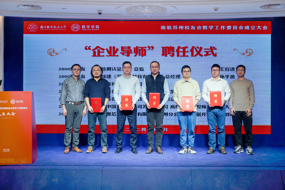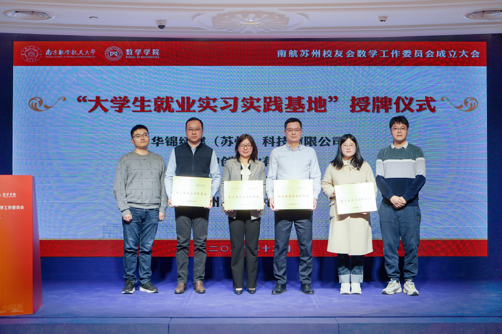 为更好凝聚育人合力,发挥校友力量,大会进行了英国365公司官网企业导师聘任仪式,并与在苏企事业单位共建了一批“大学生就业实习实践基地”。学院大学数学教学与研究中心主任朱晓星、数学系副主任潘星宏为2000级校友王衍进、孙平波、2001级校友杜斌、2003级校友林青春、2004级校友朱叶峰、2006级校友朱大龙颁发“企业导师”聘书。计算科学系副主任唐与聪、概率统计系副主任陈鹏,与周晓英、孙平波、杜斌、赵紫曼共同为实习实践基地揭牌。
