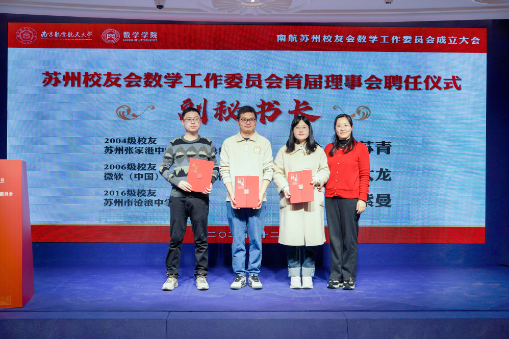 许静为数学专业2000级校友、苏州中创铝业有限公司总经理周晓英颁发会长聘书,王春武为1999级校友、昆山市市场监督管理局千灯分局副局长郁胜杰,2001级校友、苏州智惟科技有限公司CEO杜斌颁发副会长聘书,龚跃政为2000级校友、相城区退役军人事务局副局长谢景超颁发秘书长聘书,院长助理吴健为2004级校友、中山证券有限责任公司唐苏青,2006级校友、微软(中国)有限公司苏州分公司高级软件工程师朱大龙,2016级校友、苏州市沧浪中学校教师赵紫曼颁发副秘书长聘书。