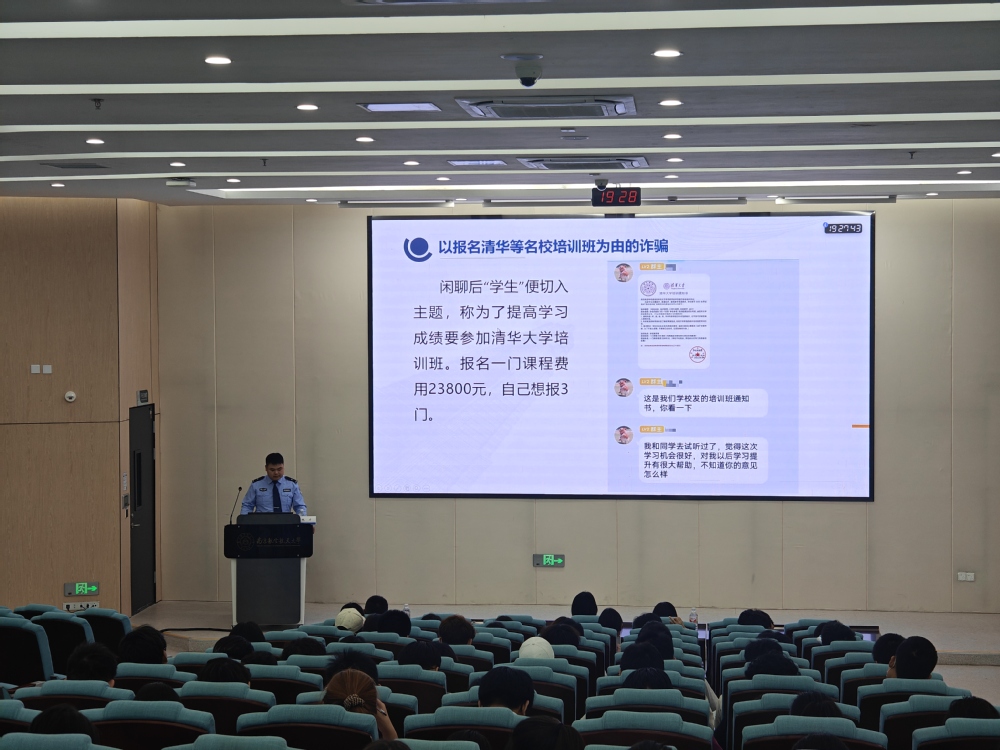 为有效提升学生对电信网络诈骗的识别和防范能力,营造安全和谐的校园环境,5月14日晚,英国365公司官网在天目湖校区牧星楼T2110教室举办“天目护航”防诈安全教育专题讲座。古县派出所民警兼英国365公司官网法制辅导员鲍力主讲,学院党委副书记王亚鹏、2024级辅导员赵美婷、迪丽以及2024级全体本、预科生到场参加。