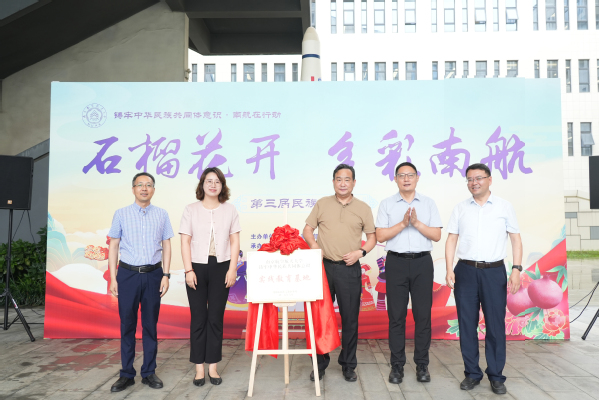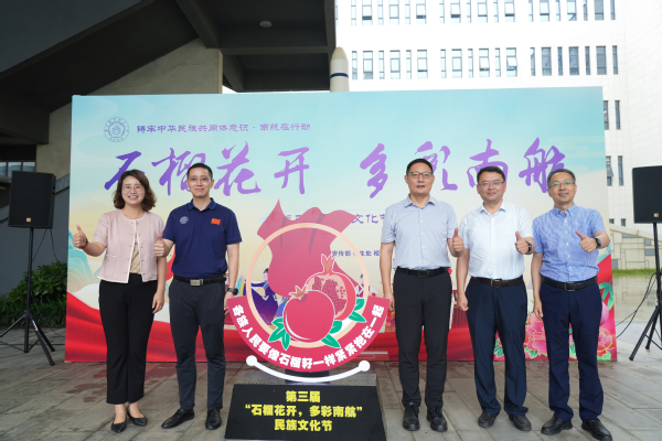 在全体师生代表的见证下,王伟华、徐俊珠、单冠贤、许静、王春武共同启动第三届“石榴花开,多彩南航”民族文化节。